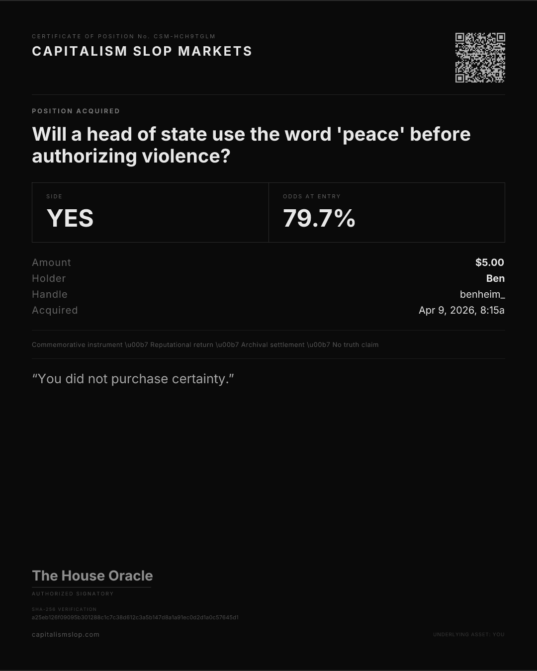 Will a head of state use the word 'peace' before authorizing violence?